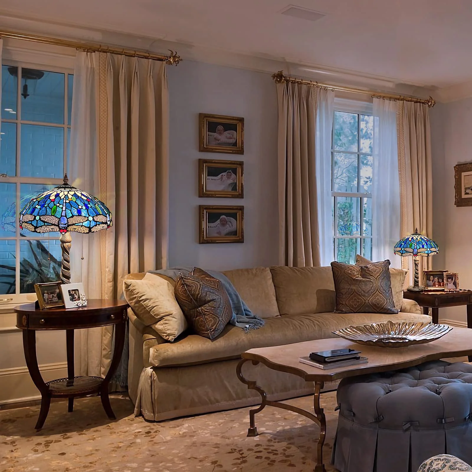 Capulina Tiffany Table Lamp, Sea Blue Dragonfly Antique Style Stained Glass Reading Desk Lamp 16x16x24 Inches for Home Office Living Room Bedrooms Study