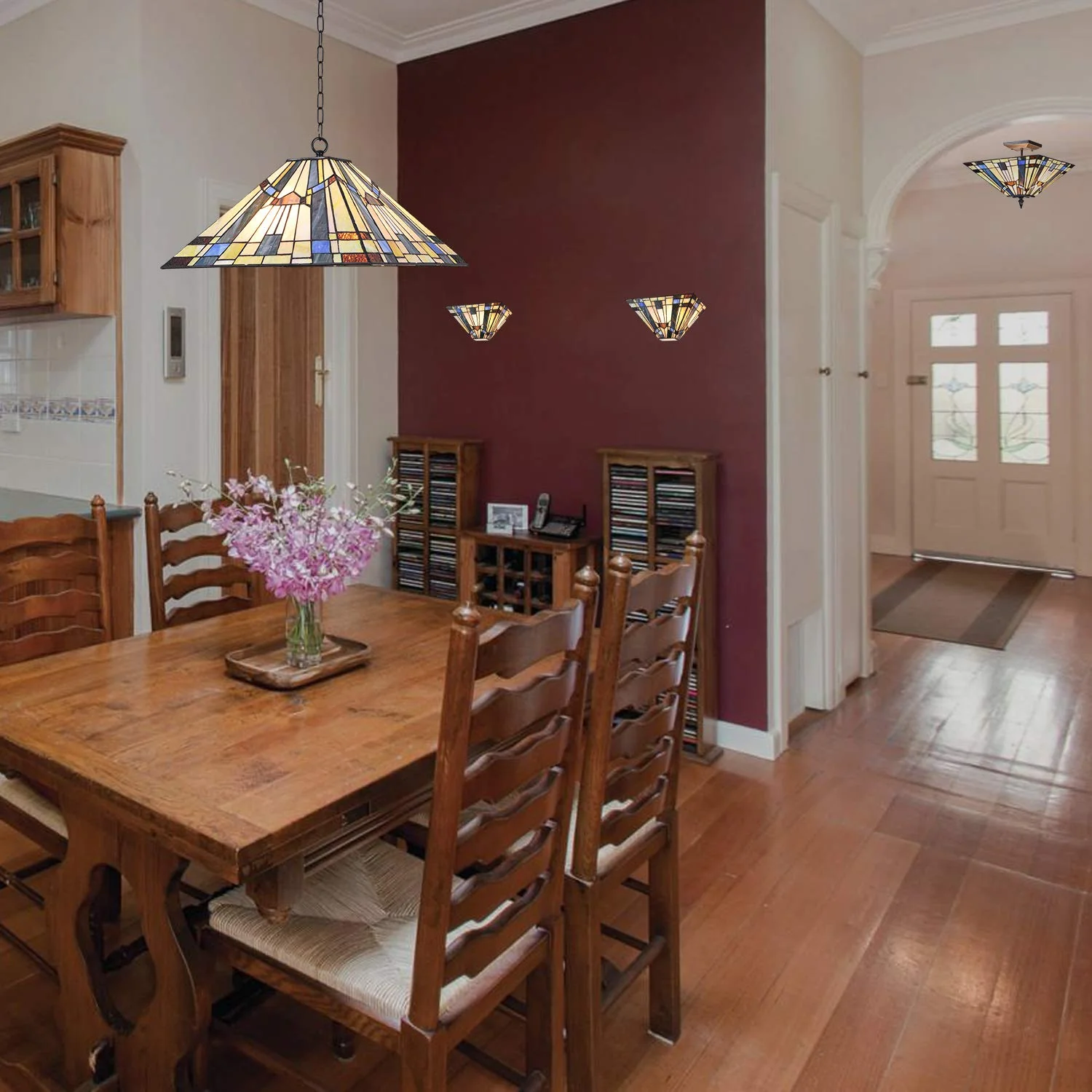 - 【elegant and romantic Tiffany Pendant Lamp was the perfect solution】Tiffany Style Kitchen Hanging Fixtures allows the light to filter in but also softens the heat and it throws gorgeous colors around the room as well! What could be more charming than Tiffany Chandeliers for Dining Room in the afternoon or morning sunlight? Each command attention for their own Unique individuality and are simply amazing to look at with the sunlight shining through.